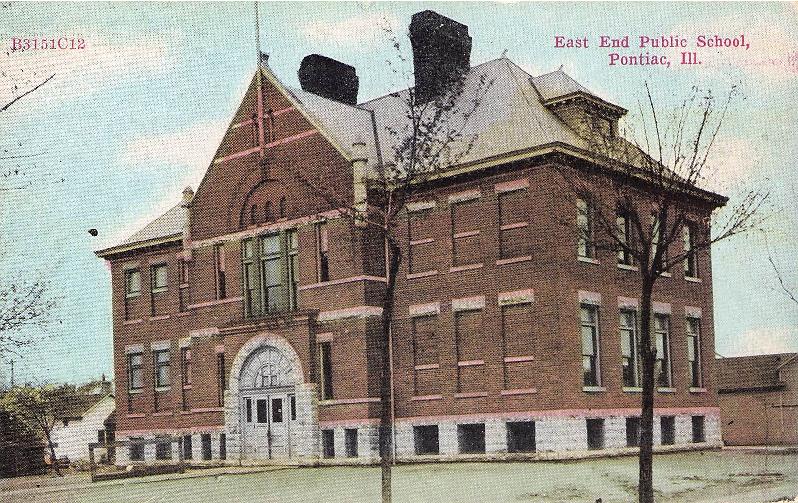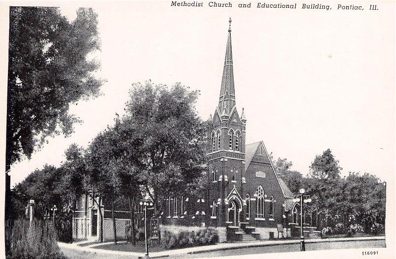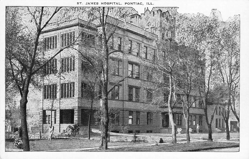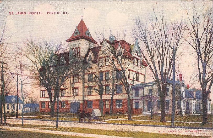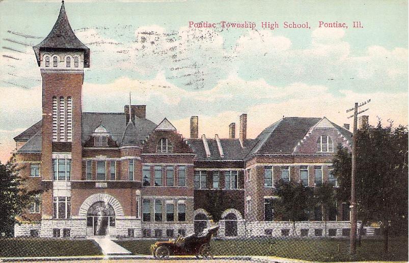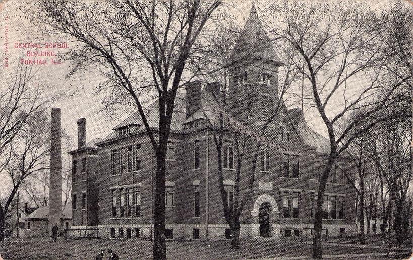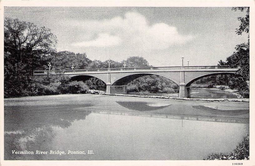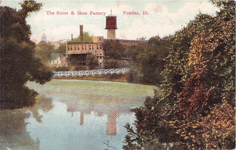 - Post cards: “The River & Shoe Factory” [1909]; “St. James Hospital,” horse & buggy, [1909]; “St. James Hospital” [c. 1930]; “East End Public School” [1910]; “Pontiac Township High School” [1910]; “Central School Building” [B&W, 1910]; “Livingston County Sanitorium” [c.1930]; “Methodist Church and Educational Building” [B&W, c.1930]; “Vermilion River Bridge” [B&W, c.1930]