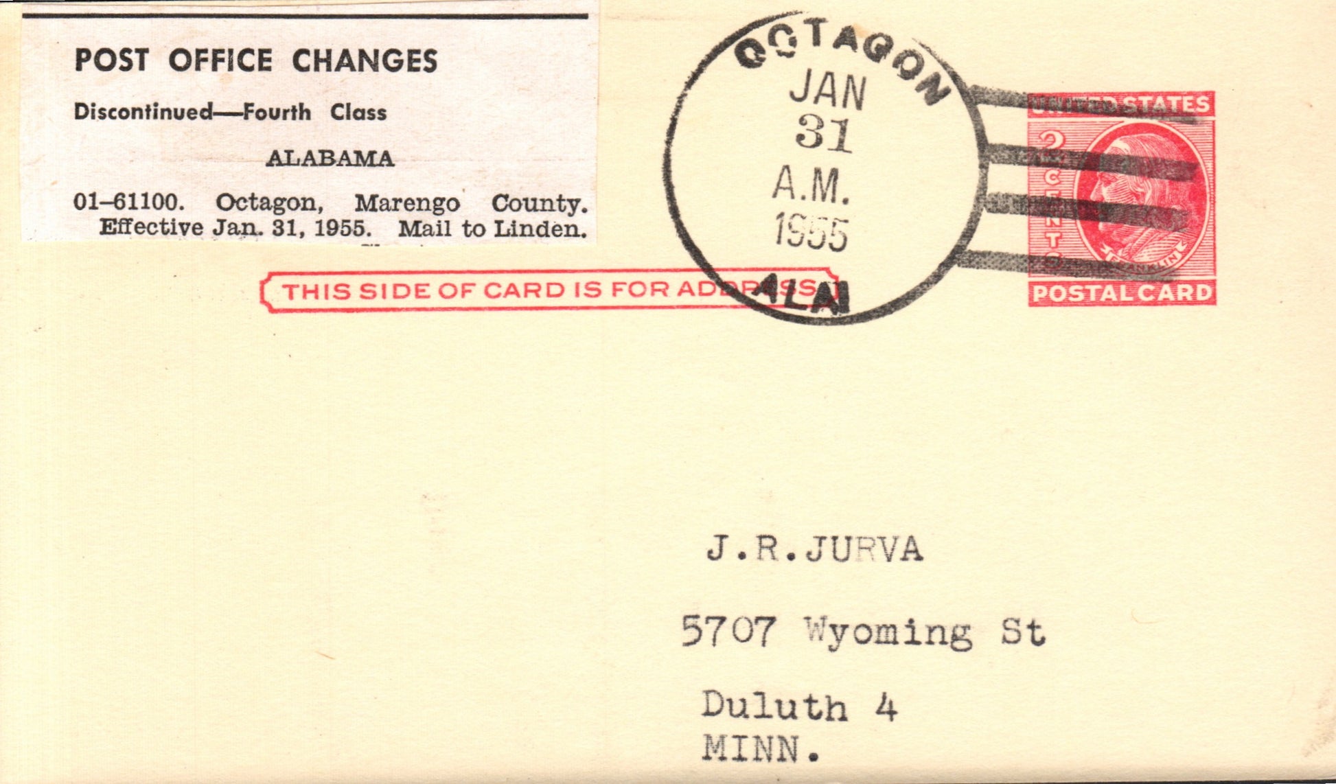 Octagon (1876/1955) 1955 4-bar on LD Postal Card, round dater on back