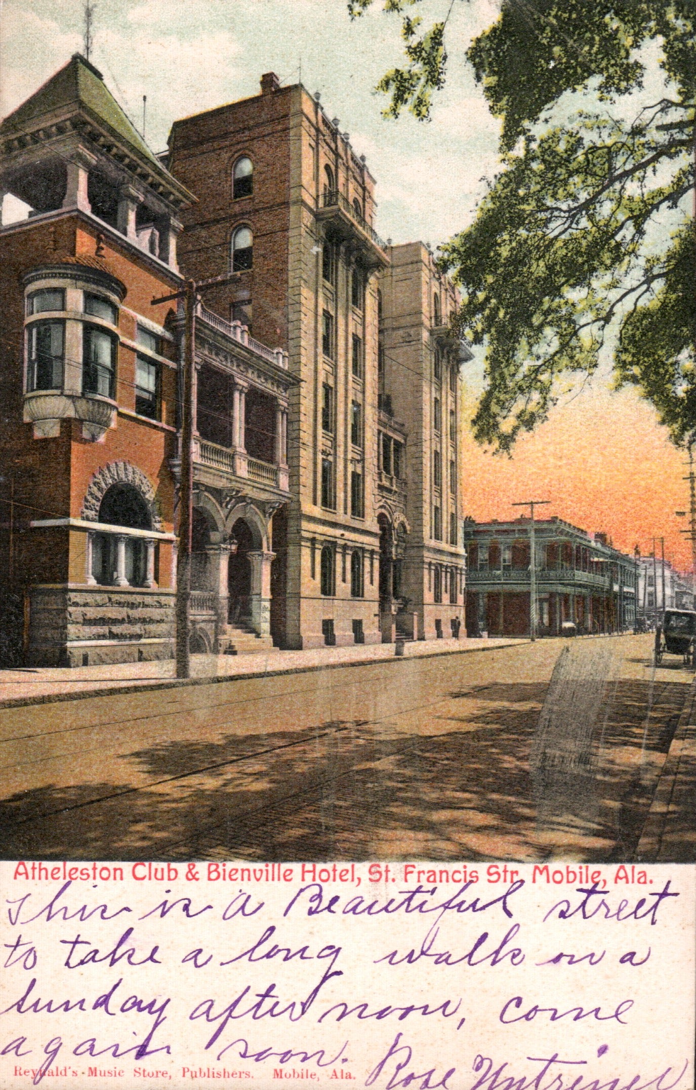 Post cards: Downtown from across water [Continental size]; Bienville Hotel [1906]; Battle House (hotel) [linen]; Admiral Semmes Hotel [chrome]; Oleson Motel [chrome]; Bienville Square [1907]; “Bienville Square and Cawthon Hotel [linen, 1949]; Providence Hospital [Continental]; Seamen’s Club [linen]; Government Street scene [chrome]; “Jesuit College, Spring Hill” [c.1910]; “Spring Hill College Chapel” [chrome]; Docks, sailboats [1907 R.P.O. postmark “Rec’d Louisville KY via Cin & Nash Tr.4” & sadly 2 tack punctures]; 5 Bellingrath Gardens [5 views, two linen, two chrome, one Continental]; Washington Park [1907]; Raphael Semmes monument [1907]; Azaleas in bloom [1 chrome, 1 Continental]; Fire Museum [chrome]; Museum of the City of Mobile [Continental]; Condé-Charlotte Museum [Continental]; “Interior of Bankhead Tunnel...” [linen]